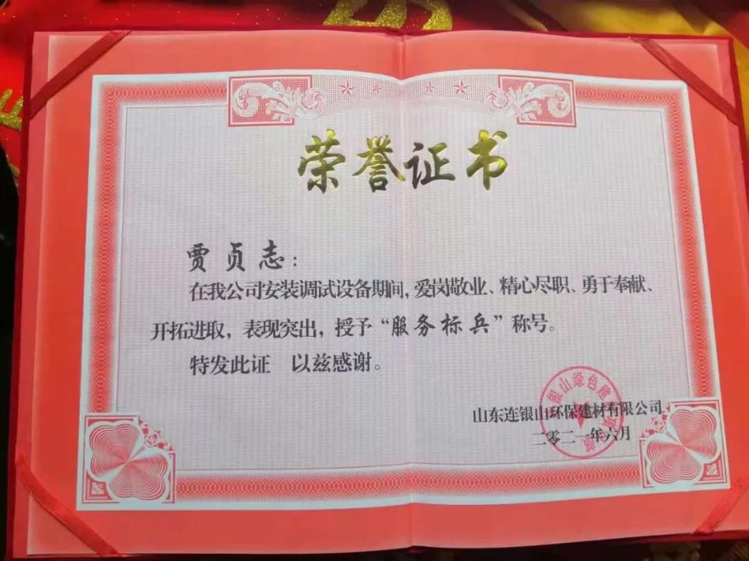 炎炎夏日,天意機械在向客戶山東連銀山環(huán)保建材有限公司售出保溫裝飾一體化板生產(chǎn)線之后,隨即派出售后團隊對設備進行安裝調(diào)試及售后培訓。售后團隊不畏酷暑,精心、耐心、專業(yè)地為客戶進行安裝調(diào)試,贏得了客戶的好評和認可,客戶為表達謝意,特授予天意機械售后人員榮譽證書和錦旗,以表彰售后人員愛崗敬業(yè)、精心盡職、勇于奉獻、開拓進取的精神。