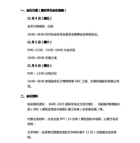 2014 年南京年會以來的新技術(shù)、新材料和新裝備成果;展示上海迪士尼GRC 典型示范工程風(fēng)采;研討 GRC 技術(shù)與產(chǎn)品研發(fā)方向;匯報 2015 年迪拜國際 GRC 年會及國際 GRC 發(fā)展方向;介紹《玻璃纖維增強水泥(GRC)建筑應(yīng)用技術(shù)規(guī)程》建工標(biāo)準(zhǔn)制定情況;觀摩曲阜孔子博物館等 GRC 工程。為滿足與會者的要求,大會還將特邀相關(guān)部門專家作裝配式建筑發(fā)展導(dǎo)向性報告。