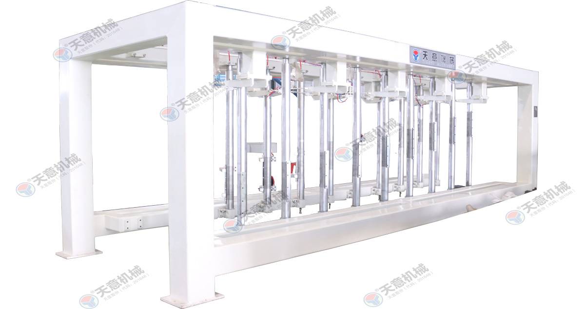翻轉(zhuǎn)吊機(jī):抓取模箱翻轉(zhuǎn)90°,側(cè)立在切割小車上進(jìn)行切割;切割工段空翻脫模機(jī)將模框翻轉(zhuǎn)90°,放在切割小車支座上進(jìn)行脫模,脫模后的模框與清理后的側(cè)模板進(jìn)行合模,合膜后的空??虮坏踹\(yùn)至模具回程軌道上進(jìn)行涂油處...